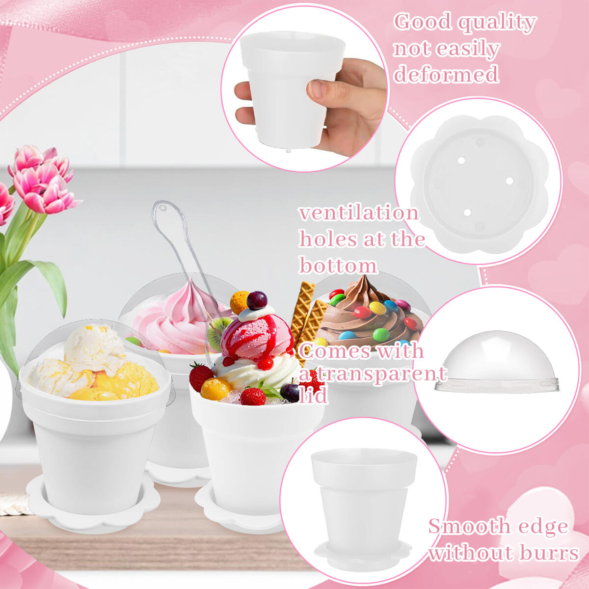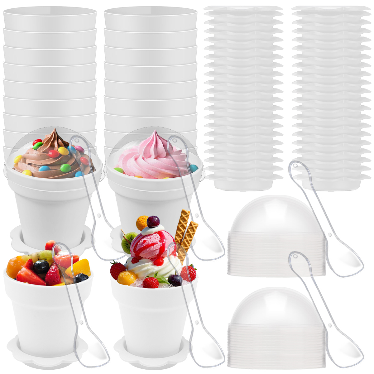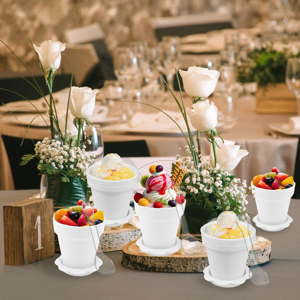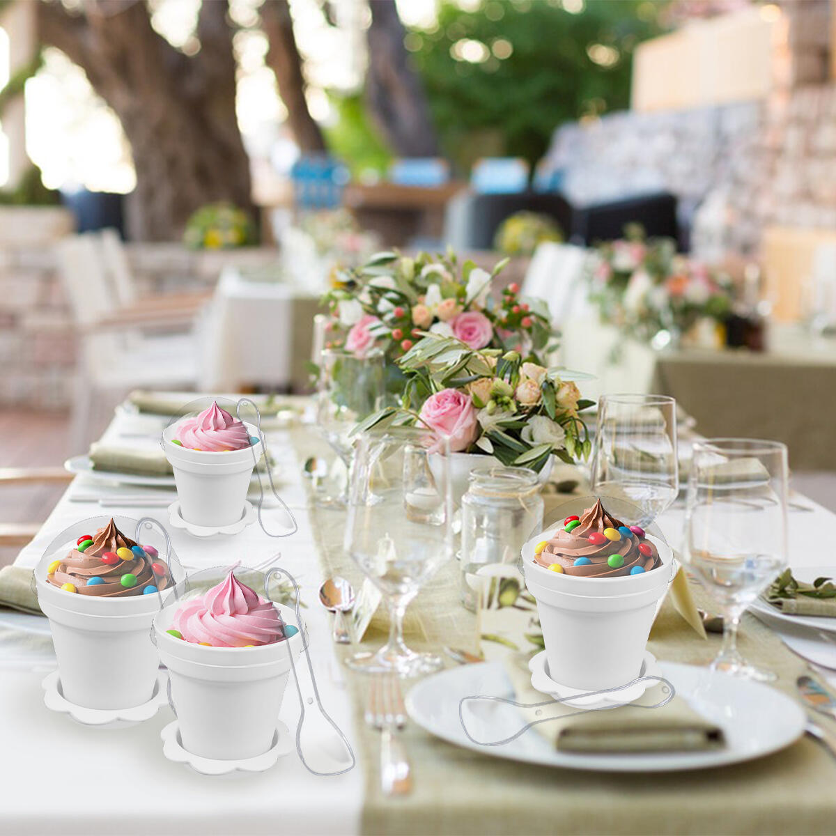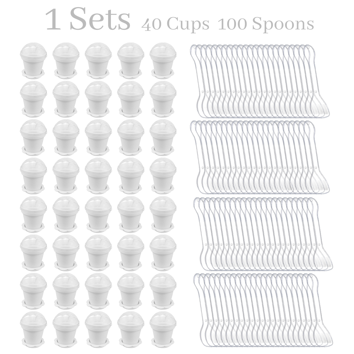 Package contents: 40 Pcs Flowerpot Dessert Cup with Lid and Bottom Tray 100 Pcs Spoons
