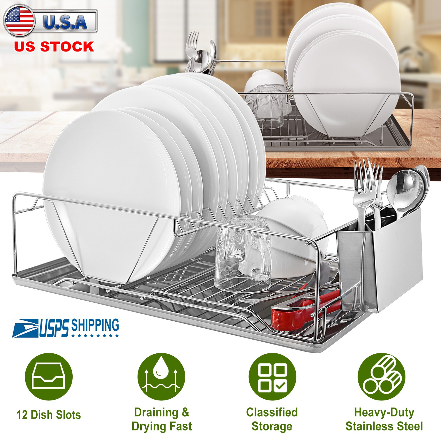 Our dish rack adopting high-grade stainless steel materials and premium electroplating finish is sturdy, durable, not easy to rust and gorgeous to match with all types of kitchen rooms. It can not only store your dishes, cups and bowls in order but also can accelerate air circulation and dry the tableware quickly to avoid the breeding of bacteria with its wholly hollow-out design. Additionally, it specially comes with a detachable cutlery holder which has three compartments inside and overspreads drain holes at the bottom to store the cutleries and a drain board to collect dishwater and allow the dish rack stands in place without sliding.